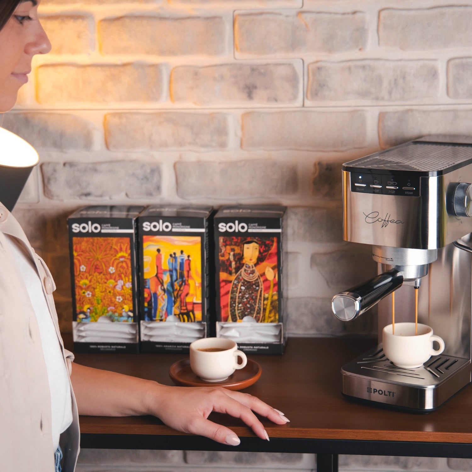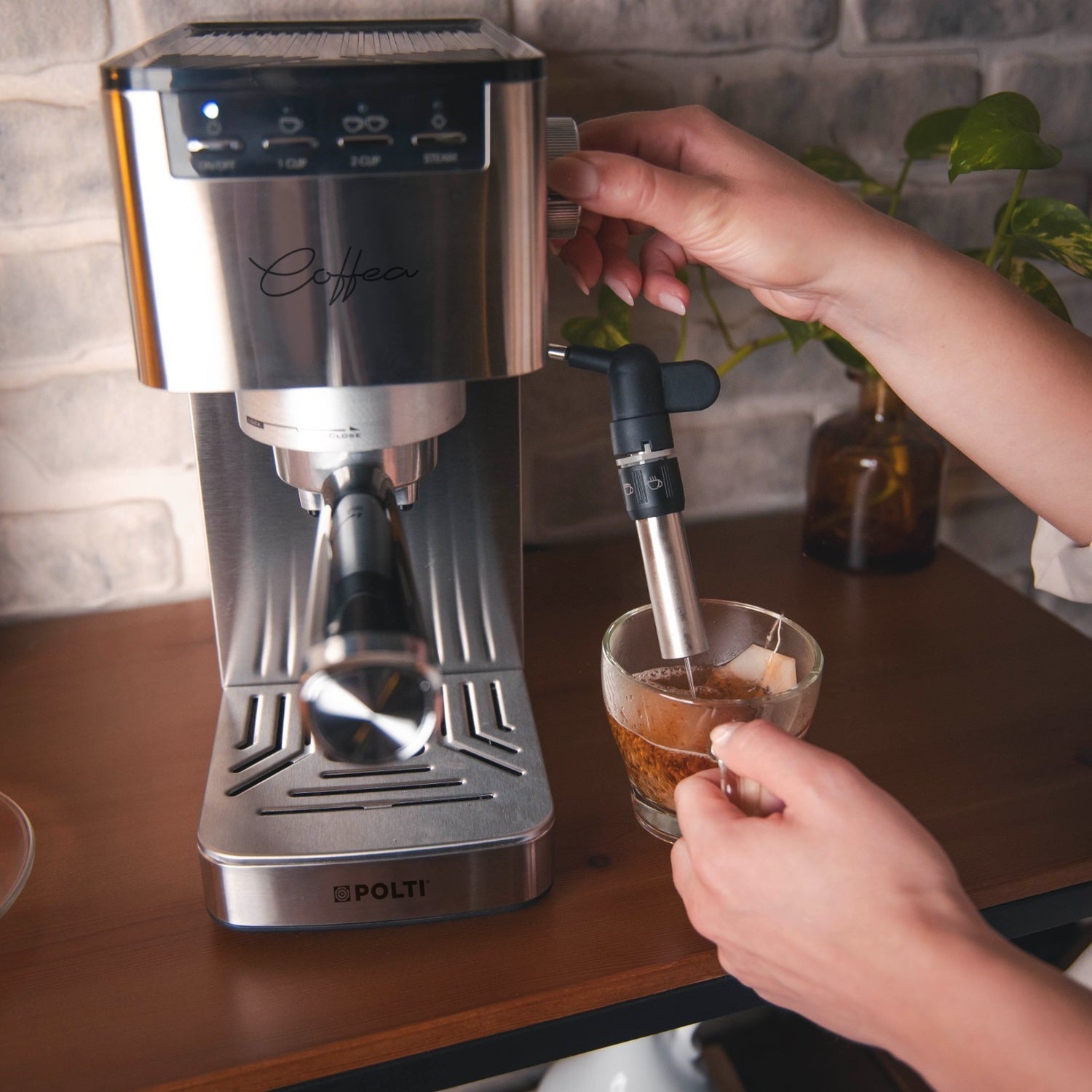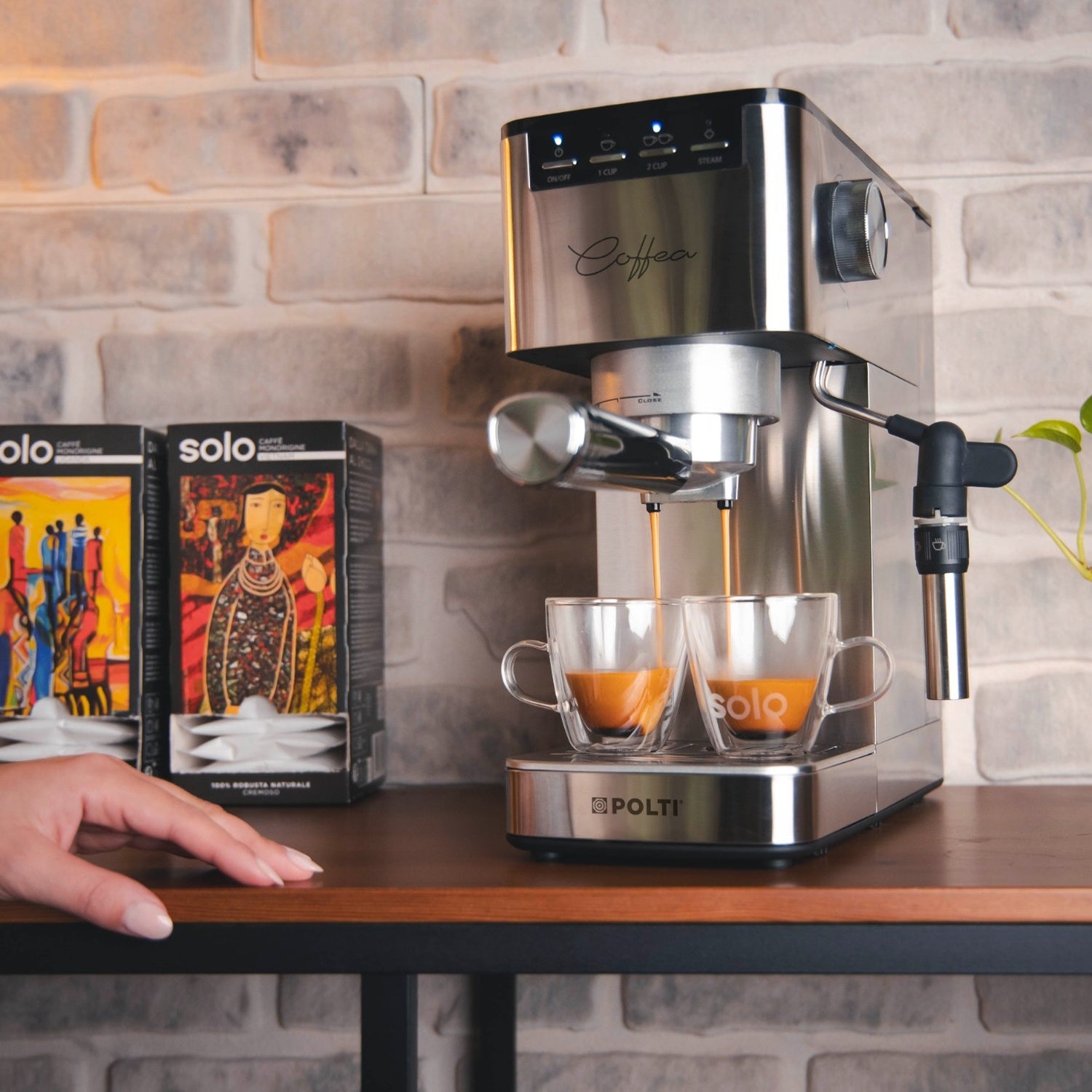 Polti Coffea je elegantni aparat za espresso koji svojim modernim dizajnom od nehrđajućeg čelika i kompaktnošću – širine samo 13 cm – savršeno nadopunjuje svaki kuhinjski prostor. Unatoč svojoj veličini, nudi iznimnu svestranost: možete pripremiti espresso s mljevenom kavom ili ESE kapsulama , dok vam funkcija SteamyMilk omogućuje pripremu savršeno kremastog cappuccina, mliječne pjene, vruće čokolade, čaja i drugih toplih napitaka.