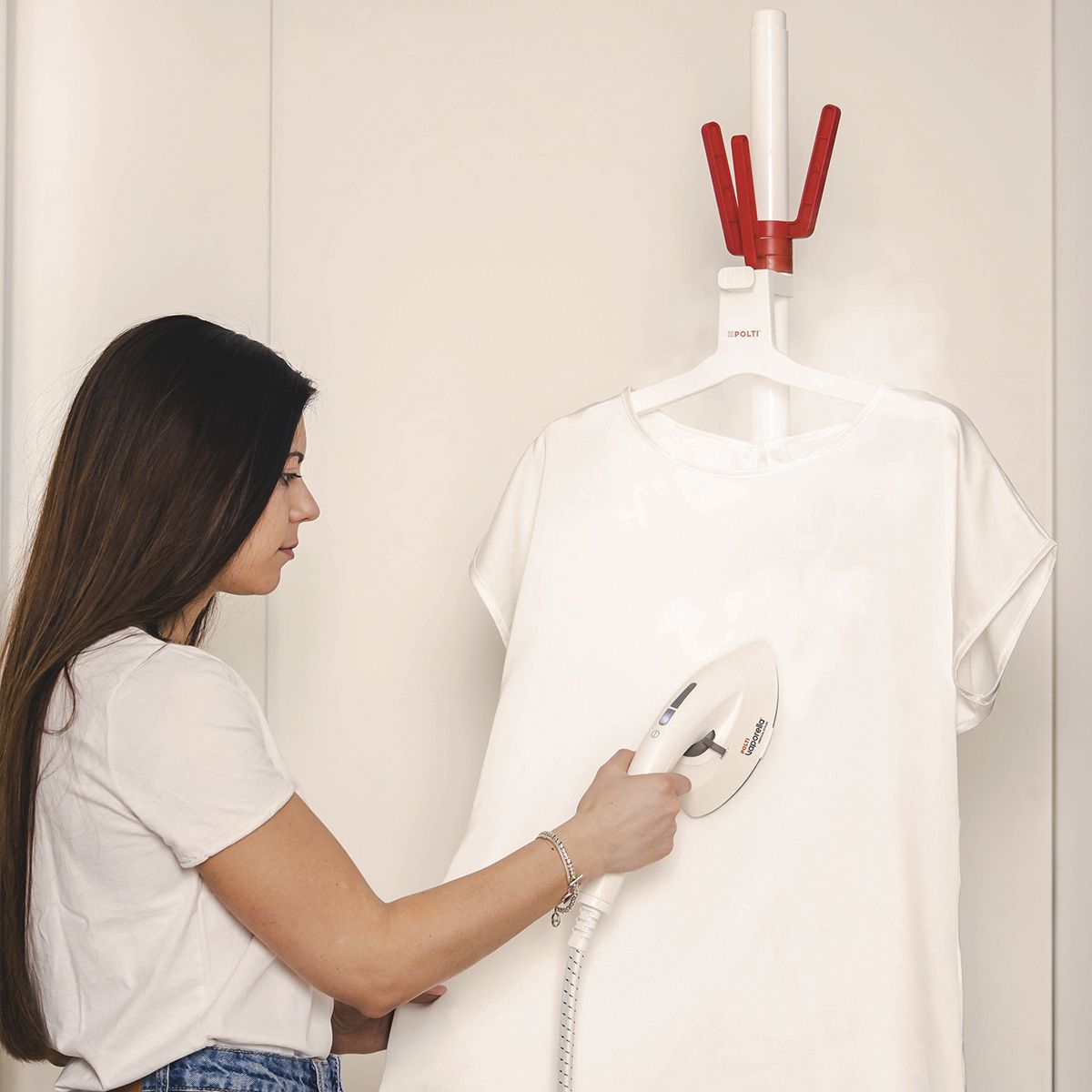 Priložena ekskluzivna vješalica omogućuje vam peglanje i osvježavanje odjeće izravno na vješalici ili služi kao držač za vašu omiljenu vješalicu . Elegantno rješenje za savršeno složenu odjeću bez daske za peglanje.