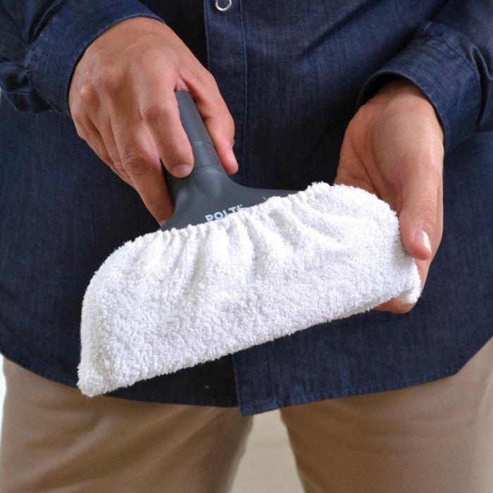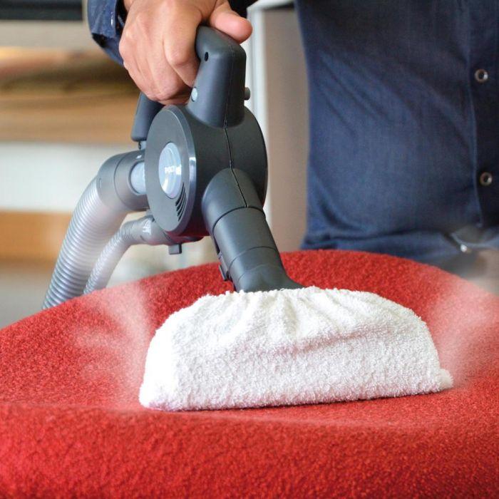 Pamučna kapa pričvršćena je na 2-u-1 četku za čišćenje tkanina i presvlaka: para otapa prljavštinu, dok spužvasta tkanina upija i skuplja ostatke. Krpe se mogu prati u perilici rublja na 60°.